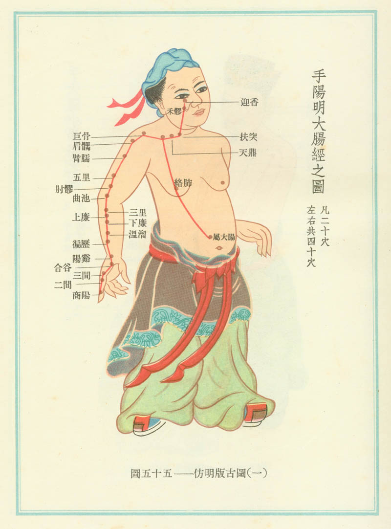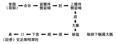 | 经脉循行: 《灵枢·经脉》:大肠手阳明之脉,起于大指次指之端,循指上廉,出合谷两骨之间,上入两筋之中,循臂上廉,入肘外廉,上臑外前廉,上肩,出髃骨之前廉,上出于柱骨之会上,下入缺盆,络肺,下膈,属大肠。 其支者:从缺盆上颈,贯颊,入下齿中;还出挟口,交人中——左之右、右之左,上挟鼻孔。 联系脏腑:大肠、肺、口、面颊、下齿、鼻 |