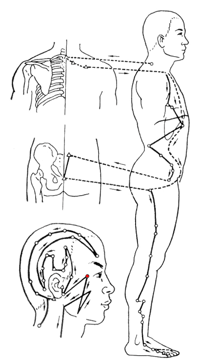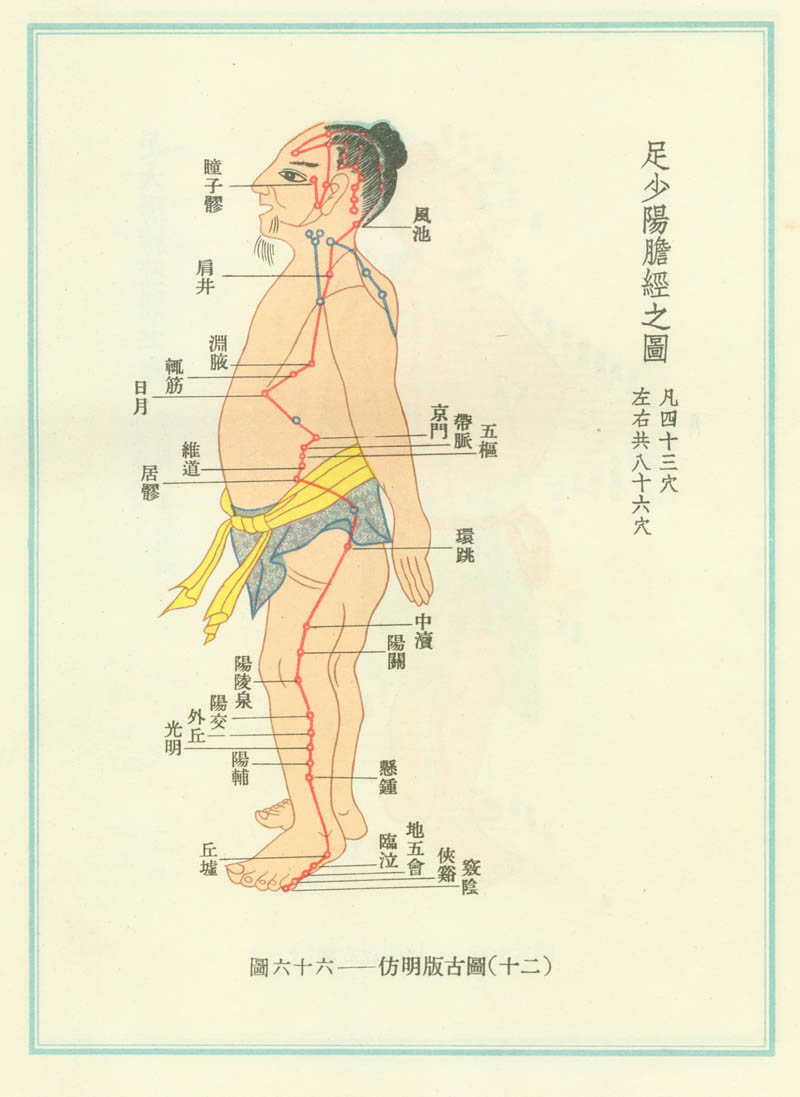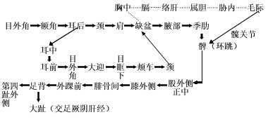 | 经脉循行: 《灵枢·经脉》:胆足少阳之脉,起于目锐眦,上抵头角,下耳后,循颈,行手少阳之前,至肩上,却交出手少阳之后,入缺盆。 其支者:从耳后入耳中,出走耳前,至目锐眦后。 其支者:别锐眦,下大迎,合于手少阳,抵于,下加颊车,下颈,合缺盆——以下胸中,贯膈,络肝、属胆,循肋胁里,出气街,绕毛际,横入髀厌中。 其直者:从缺盆下腋,循胸,过季胁,下合髀厌中。——以下循髀阳,出膝外廉,下外辅骨之前,直下抵绝骨之端,下出外踝之前,循足跗上,入小指次指之间。 其支者:别跗上,入大指之间,循大指歧骨内,出其端,还贯爪甲、出三毛。 联系脏器:胆、肝、膈、耳、眼、咽喉。 |