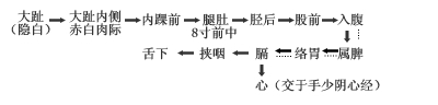 | 经脉循行: 《灵枢•经脉》:脾足太阴之脉,起于大指之端,循指内侧白肉际,过核骨后,上内踝前廉,上踹内,循胫骨后,交出厥阴之前,上膝股内前廉,入腹,属脾,络胃,上膈,挟咽,连舌本 ,散舌下。 其支者:复从胃,别上膈,注心中(脾之大络,名曰大包,出渊腋下三寸,布胸胁)。 联系脏腑:脾、胃、心、咽、舌 |