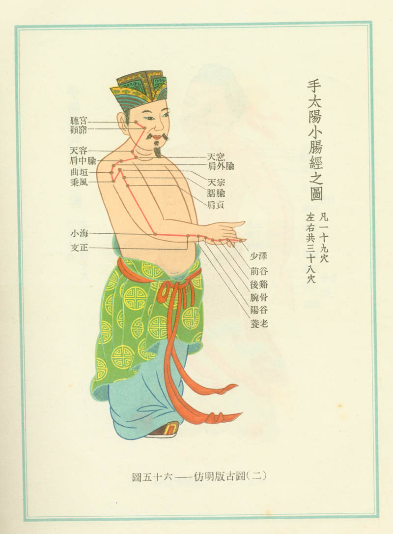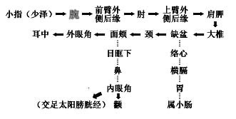 | 经脉循行: 《灵枢•经脉》:小肠手太阳之脉,起于小指之端,循手外侧上腕,出踝中,直上循臂骨下廉,出肘内侧两骨之间,上循外后廉,出肩解,绕肩胛,交肩上,入缺盆,络心,循咽下膈,抵胃,属小肠。 其支者:从缺盆循颈,上颊,至目锐眦,却入耳中。 其支者:别颊上(出页),抵鼻,至目内眦(斜络于颧)。 联系脏腑:小肠、心、胃、咽喉、鼻、目、耳 |