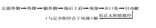 | 经脉循行: 起于足跟外侧,经外踝上行腓骨后缘,沿股部外侧和胁后上肩,过颈部上挟口角,进入目内眦,与阴蹻脉会合,再沿足太阳经上额,与足少阳经合于风池。 《难经•二十八难》:阳跷脉者,起于跟中,循外踝上行,入风池。 联系脏腑:咽喉、眼目、脑。 |
